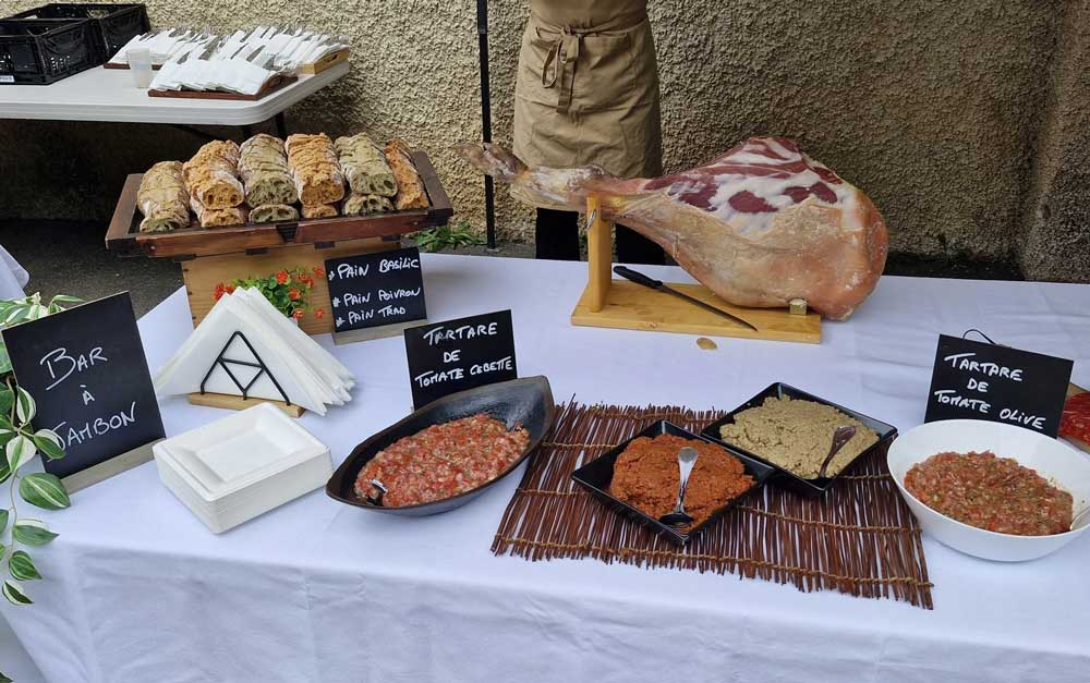 Pour les afterworks ou les journées clients, plusieurs ateliers peuvent être intégrés : jambon serrano, coquillages, saumon gravelax, brasero, fromage ou fruits.
